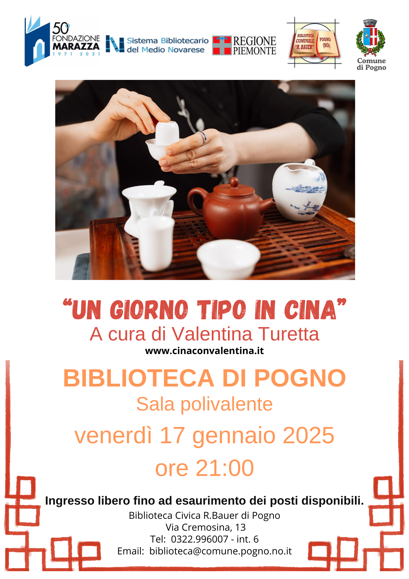 La relatrice della rassegna che viene ospitata nelle varie biblioteche del Sistema è Valentina Turetta e per la nostra serata pognese l'argomento sarà "Un giorno tipo in Cina", usi e costumi.